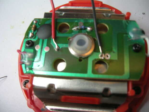 En primer lugar, las conexiones existentes son desoldar de la ubicación que se muestra en la foto y como se explica la los enlaces de arriba. Luego se sueldan dos cables en las posiciones descritas que fue conectado a un jack mono de 1/4".