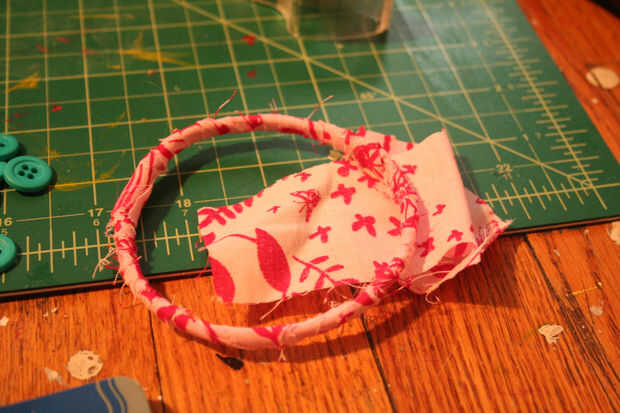 A continuación, cortar 1/2" piezas de tela y envolver alrededor de la brida, ajustándola periódicamente con hot glue para permanecer en el lugar.