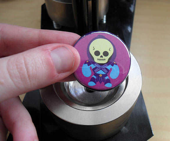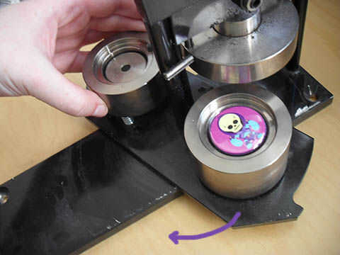 Gire la mesa morir para revelar el botón terminado. Levantará derecho fuera el Crimp Die, listo para ser usado! Una vez que se familiarice con la máquina de botón es fácil de batir a docenas en una sesión.