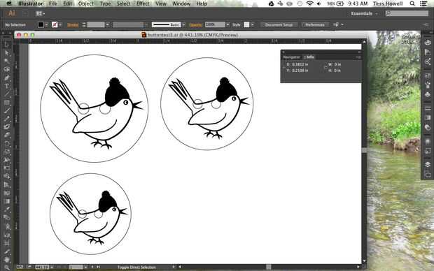 Usando Adobe Illustrator, dibujé mi diseño de botón. Decidí tener un wren un sombrero con un POM-POM. El wren ha hecho muchas apariciones en mis trabajos de ganchillo (puso un pájaro en él!) y fue incluso la inspiración para un logotipo de la empresa (www.etsy.com/shop/theswedishwren). El logo de pájaro sería grabado en el botón. También me decidí a hacer un simple botón de 2 agujeros en lugar de un botón de 4 agujeros.