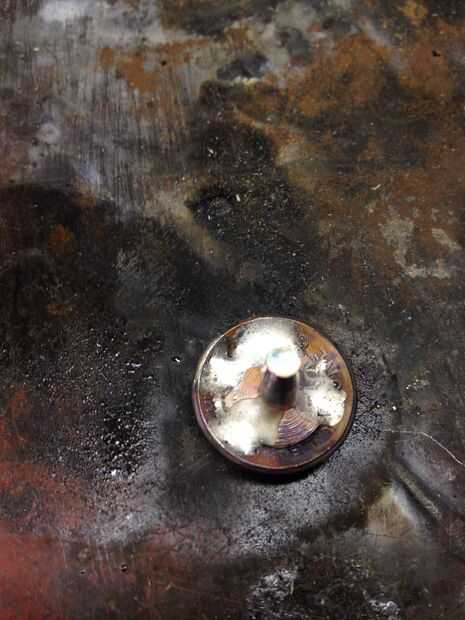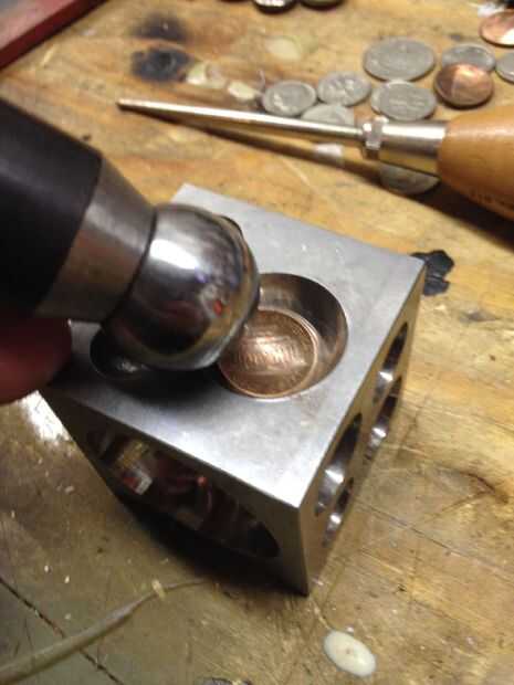 Cuando lo tengas donde usted lo desee. Deje caer un remache cobre (michaels/tandy) en el centro. De calor con un soplete de propano/butano pequeña y luego fije el poste a la moneda con alguna soldadura. Una vez que se haya enfriado, es tiempo de brillar con una voluntad de búfer. También puede obtener una rueda que pulimenta para una dremel.