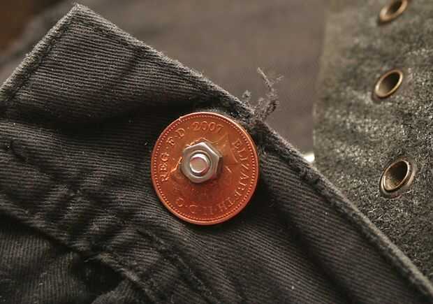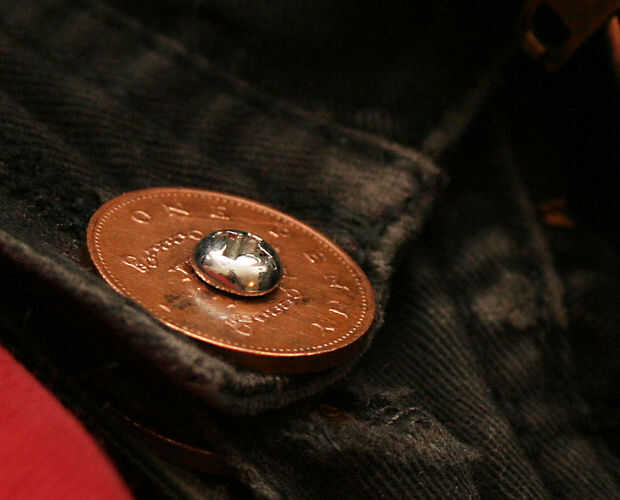 Estos pantalones vaqueros tenían un gran agujero donde debería estar el botón. No es una reparación rápida sin botones remaches y habilidades de costura que aspiran a la mediocridad.