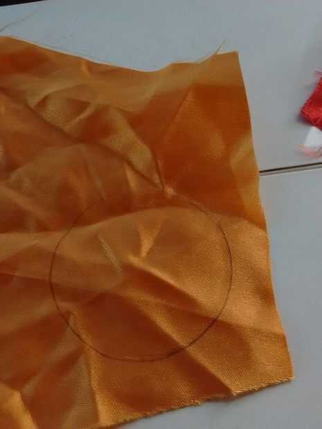 Tomar la plantilla circular ya sea una tapa o un brazalete o lo usas para dibujar el círculo y con un lápiz dibujar en la tela. Realmente no importa si dibujas sobre la cara impresa o no, como se puede ver el círculo.