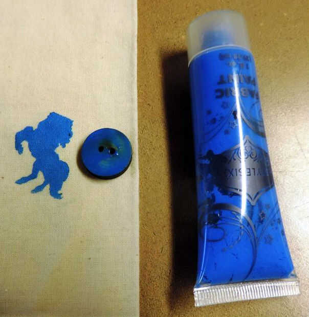Ahora la última foto es otro favorito. Tengo varias pinturas para tela y por supuesto me parece que ser aficionado del azul. Primero me aseguré de que el botón llevaría el color muy bien y luego había bordada con un diseño en el mismo color. Incluso podría teñir a la tela y los botones que del mismo color o los botones podrían ser teñido de un color más claro que el paño.