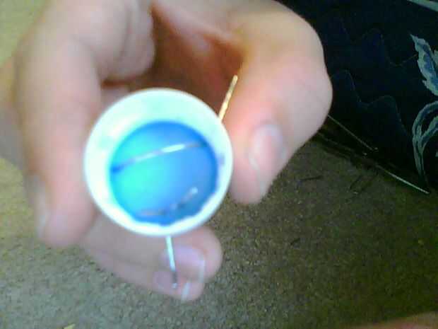 Tomar el clip de papel en forma de u grande y pega los extremos por la parte inferior de los orificios de la parte superior 2 en la tapa de la botella. Empujar todo el camino a través de asegurándose de que los extremos son incluso. A continuación tomar la aguja alicates y doblar una pequeña abajo lazo ward en los puntos 2. Ahora tome el pequeño palo y el el circuito de disparador en ella Asegúrese de que el gancho esté apuntando hacia abajo. Pegar los dos extremos por los 2 agujeros en la tapa de la botella que están cerca de la parte superior. Voltee la tapa hacia abajo y doblado hacia afuera de las puntas.