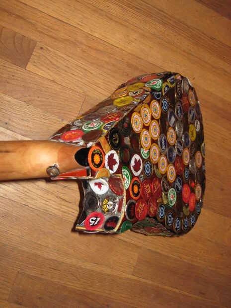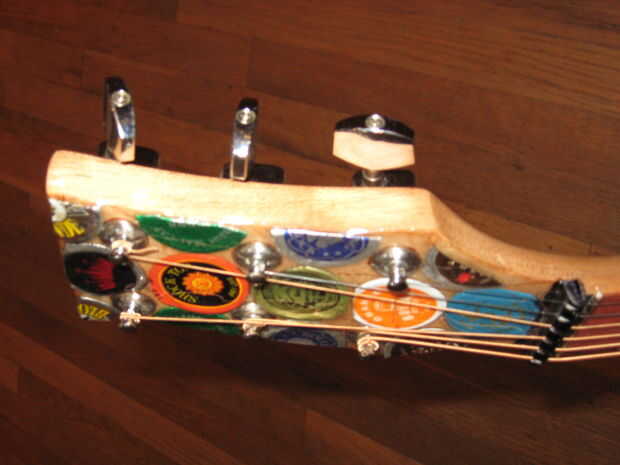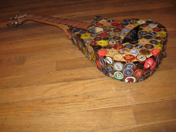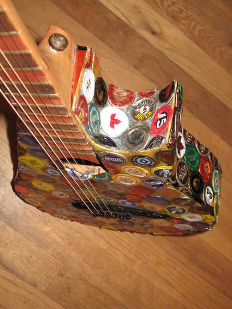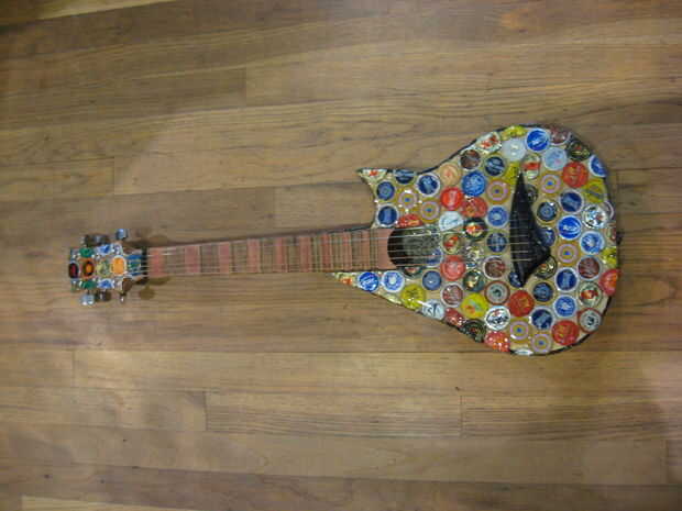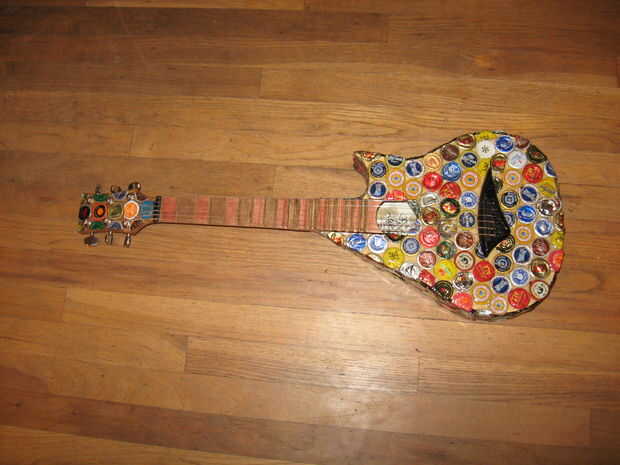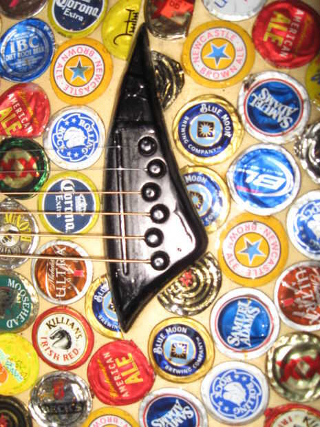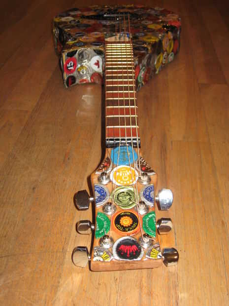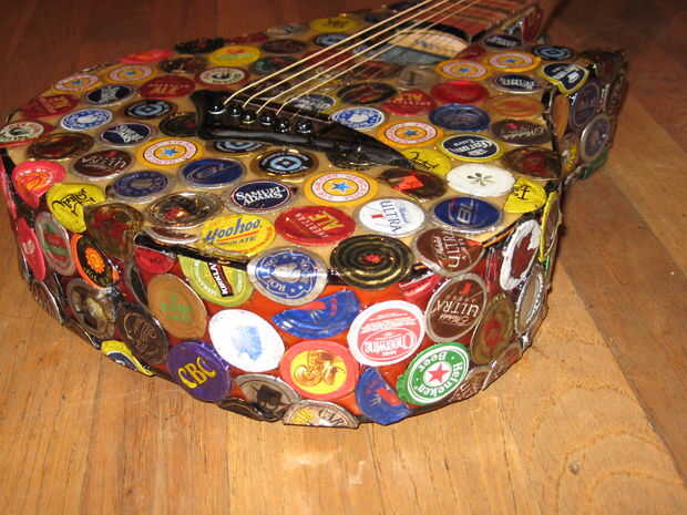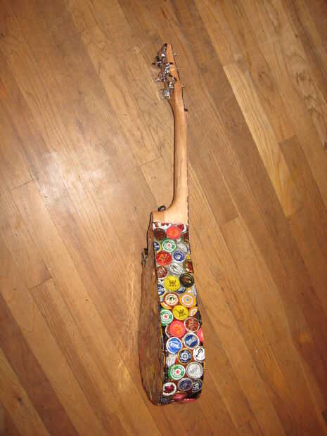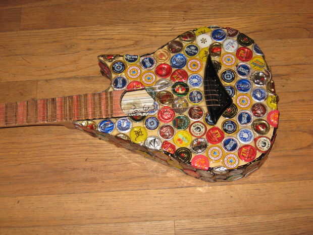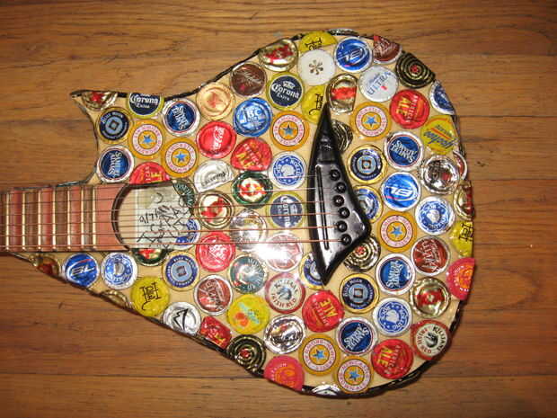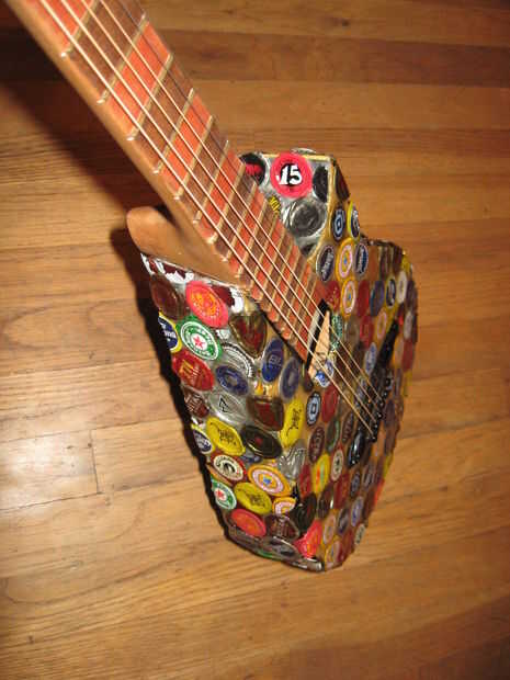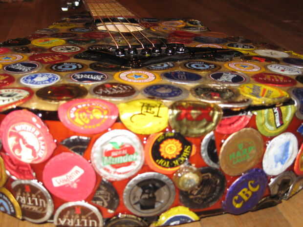 Hace unos años miraba mi vieja guitarra mini arrancador sentado en la esquina, y decidí que quería a mod. Encontró alguna inspiración de Instructables y decidió que quería cambiar la forma del cuerpo, lo rectifique y Vieira a los trastes. Esto terminó siendo un proyecto mucho más grande de lo que pensé primero. Empecé a pintar la guitarra, pero luego he encontrado a artista en Colorado que pega tapas de botellas aplastadas sobre cosas como sillas y mesas. Me inspira esto y decidió que haría lo mismo. El artista aplanadas tapas de botellas para que los bordes estaban ubicados a alrededor del parte exterior, luego que los capas como escalas. Al principio lo único podría aplanarles fue con los bordes doblados bajo, martillando la parte superior mientras que la tapa estaba sobre una superficie plana. Más tarde, encontré la manera de que la artista lo hizo, fijando las chapas boca abajo sobre una superficie y martilleo. Decidí que sólo continuaré con lo que había comenzado. Algunas tapas de botellas no martillo tan limpio como otros, pero pensé que dio la superficie variación agradable.