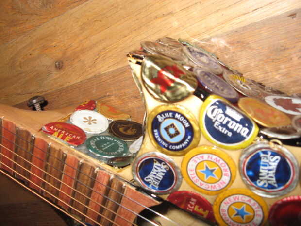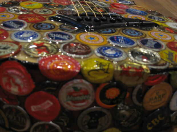 Por mucho fue el paso más tedioso, y deseo que había tenido una mejor manera de hacerlo. Para este paso, utiliza dos parte 60 minutos adhesivo de epoxy y pegados individualmente cada tapa de la botella en. Cuál es más, que tuve que cortar cada tapa para caber, doblar para adaptarse a cualquier curva en la guitarra y cortar tapas de botellas hasta para caber en cualquier agujero que me pareció demasiado grande. Esto es donde prefiero el artista en forma de Colorado, porque él no tenía vacíos a llenar después de que capas las tapas. También puse gorras en la cabeza de la guitarra. Después de este paso, las tapas eran un poco pegajosa, áspera, y algunas de ellas incluso salieron, así que decidí que necesitaba una capa de algo sobre ellos.