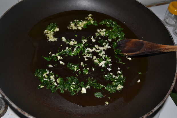 calentar aceite en una cacerola, luego agregar el ajo y el perejil cortado fino. freír por unos minutos a fuego medio.