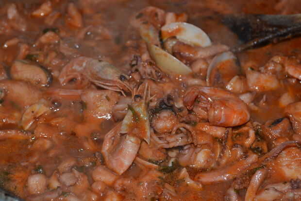 cortar los pescados en trozos grandes y añadir con los mejillones y ver comida a la sopa.