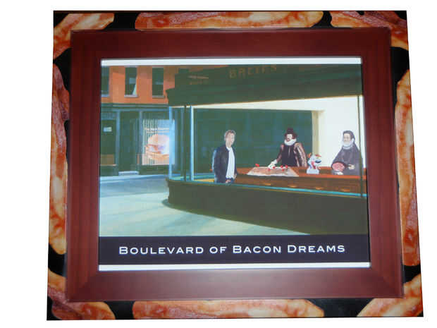 Enmarcado dentro de una arena de bacon, el "Boulevard de los sueños tocino" representa dama inglesa, erudito y la madre de Sir Francis Bacon, Ann Cooke Bacon, cocina el tocino en su comedor, "Bacies".  Como sostiene la sartén ardiente de bondad, el perro de las tiras Beggin ' relojes con entusiasmo y piensa "... su tocino, su tocino!" y tiene razón esta vez. En muchos niveles.  Kevin Bacon se encuentra en primer plano y engancha al espectador mientras que está parado delante de un mapa de los Estados Unidos.  En el mapa están marcadas las ciudades de Bacon, Washington; Tocino, Idaho; Tocino, Ohio; Tocino, Missouri; Tocino, Texas; Bacon, Georgia; y tocino, Virginia. Inglés filósofo, estadista, jurista, científico y pionero del método científico Sir Francis Bacon, estudia cuidadosamente el mapa frente a él. Mide el rumbo de la brújula entre cada ciudad y Kevin Bacon. Él tiene en su mano el sorprendente resultado: brújulas todos los títulos están a seis grados de Kevin Bacon.