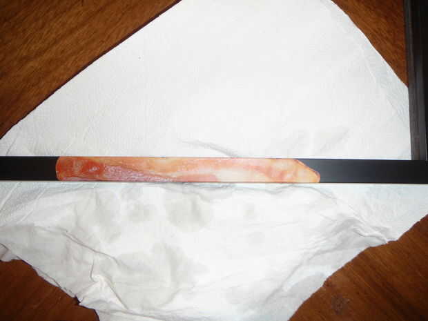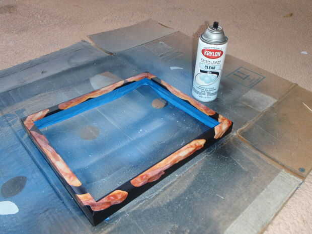 Cortar su tobogán tocino para tamaño remojo, diapositiva, aplicar al marco y deje que se seque completamente. Sello con varias capas de acrílico claro (usé acrílico transparente, en un acabado satinado Krylon).