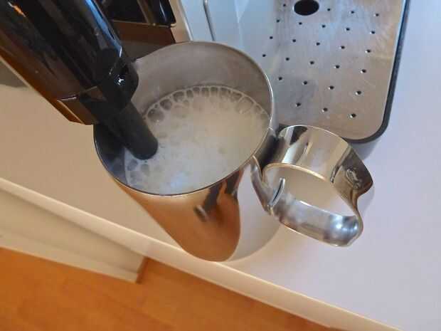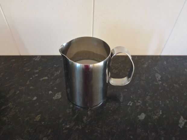 Si tienes acceso a un vapor de la leche, ahora es el momento de usarlo. Si no, la leche se puede calentar en el microondas. A menudo utilizo este método yo también, por la sencillez y facilidad de limpieza. Asegúrese de utilizar un envase seguro de microondas, así que no una taza de acero inoxidable como en la imagen. Los mencionados vasos IKEA han trabajado bien para mí. Asegúrese de no sobrecalentar la leche, que no debe alcanzar el punto de ebullición. Te recomiendo calefacción a full durante 10 segundos, luego revolver y probar y luego calor durante 10 segundos. Repita hasta que satisficiera. Para mi en el microondas unos 30-40 segundos es el punto dulce para un vaso medio lleno.