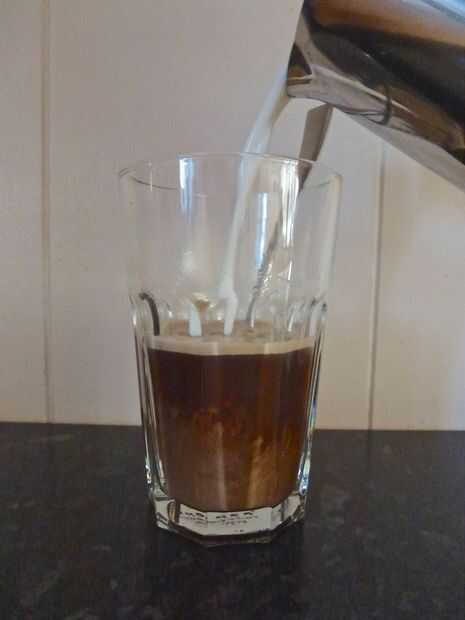 Agregar la leche caliente al café, rellenando el vaso hacia arriba.