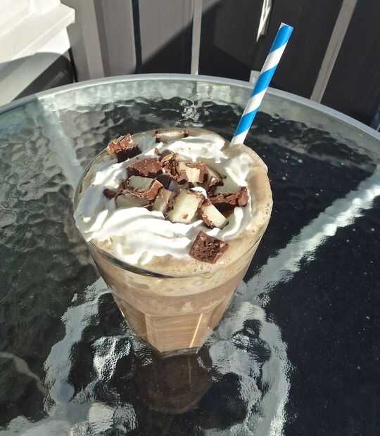Decorar el café con crema batida (Reddi-Wip o Cool Whip es perfecto), espolvorear con generosidad. Añadir más salsa si quieres. Meta en una paja.