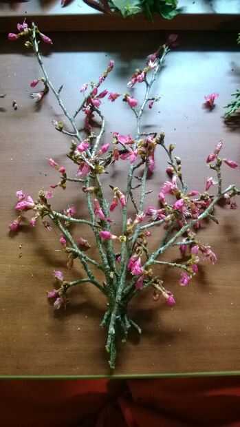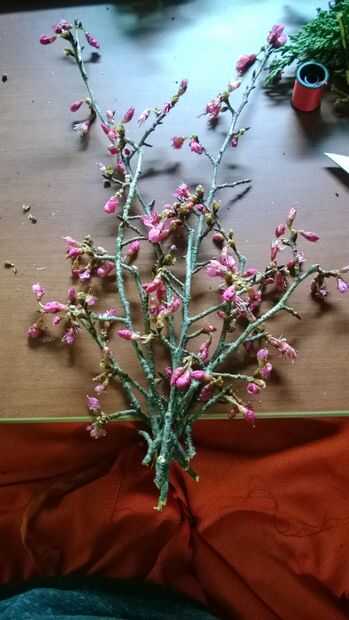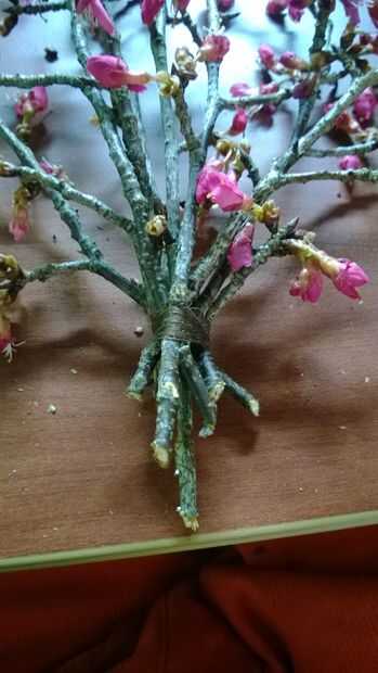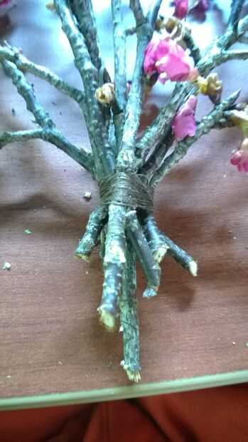 Para esto vas a querer algo semi robusto porque todo va a ser unido a él. Por suerte me encontré un árbol con varetas (madera nueva) con flores en él, así que decidí usar esto como mi base. Cuando yo estaba recogiendo mis ejemplares sólo rompí los gratis, pero cuando vayas a montar el ramo vas a cortar el forraje en alrededor de un ángulo de 45 grados, porque uno se ve bien y dos ayuda a las plantas absorben el agua más fácil. Después de cortar el final quitar exceso ramas que no necesita o si no tienen brotes. Finalmente los ponen hacia fuera en un ventilador como forma y atar firmemente y envuelva la cuerda alrededor de la base de la forma de ventilador para mantenerlo seguro.