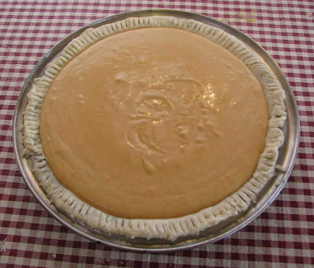 Hornea a 425 grados F (218 C) durante 20 minutos, luego baje el calor a 350 grados F (177 C) y continuar a hornear de 50 a 60 minutos, o hasta que un cuchillo insertado en el centro del relleno se salga limpio.