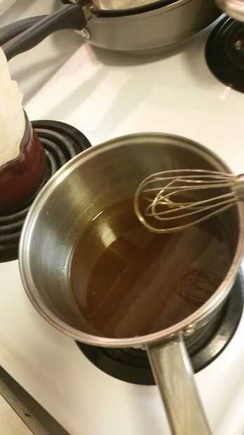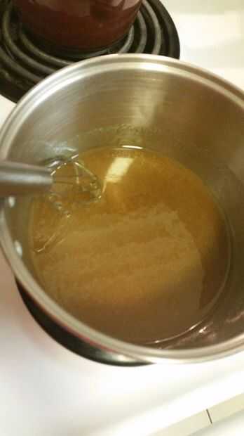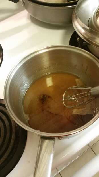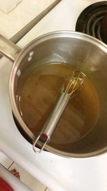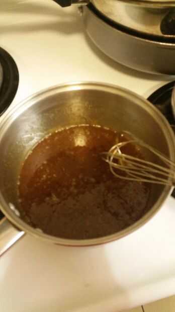 1. en una cacerola mediana, mezcle el jarabe de maíz y azúcar moreno. Calor a fuego medio bajo y batir constantemente hasta que el azúcar se disuelva. No deje que esta mezcla hierva.
