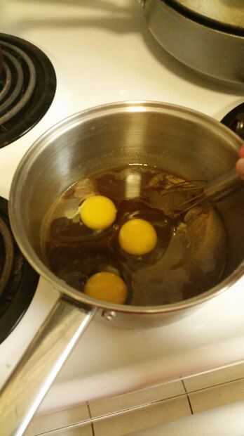 3. cuando la mezcla esté a temperatura ambiente, agregar los huevos y batir bien.
