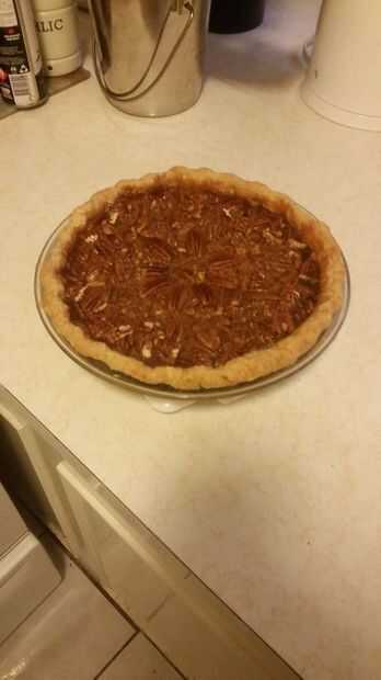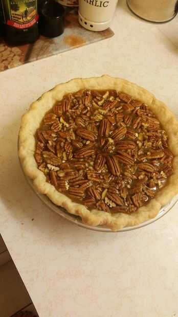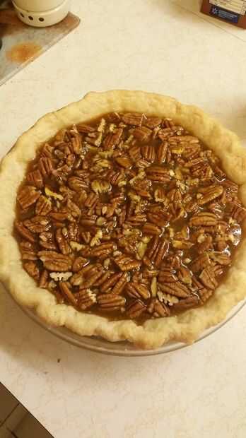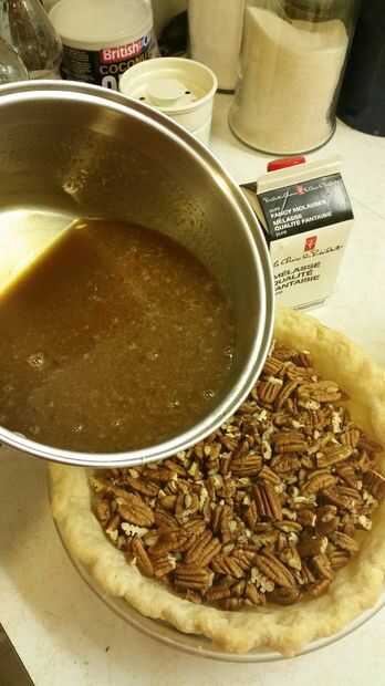 3. lentamente Vierta la mezcla de jarabe de maíz del azúcar sobre las nueces. Decorar la parte superior de la tarta con las nueces enteras si lo desea.