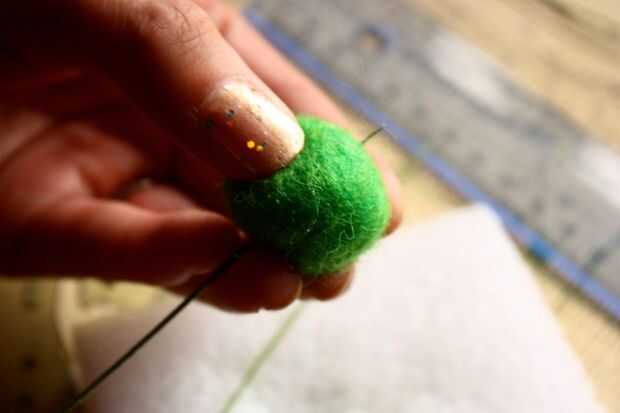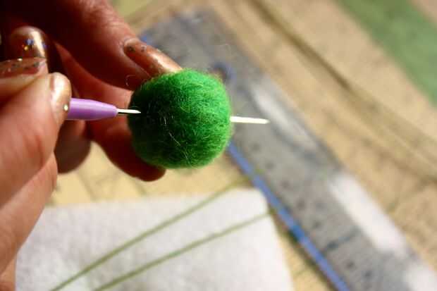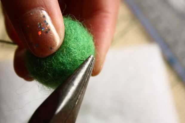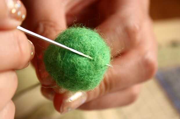 2. Con su aguja, empujar a través de la bola de fieltro, crear una guía para el vástago de pasar.