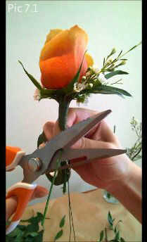 • Después de que usted tiene cerca de 1 pulgada de la flor en el ojal con cinta tienes que quitar las ramitas largas y el cable no deseado.