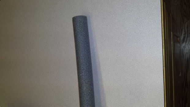Puesto que el aislamiento viene en longitudes de seis pies que tuve que recortar la segunda pieza para la longitud entera de diez pies del interior de la tubería del cojín. Para resbalar la espuma dentro del tubo que necesitaba la espuma con un diámetro exterior no superior a 1,25 pulgadas. Este relleno protege la varilla desde el temblor causado por las vibraciones durante la conducción.