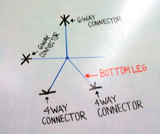 Siguiente será conectar dos conectores de 6 vías. Poner una arandela en el tornillo (van dos tornillos en cada pata) y luego coloque un brazo de un conector de 6 vías en la parte superior de la "A" pieza del Pentágono y otro conector de 6 vías a la pieza de la izquierda "A" del Pentágono. Habrá una "A" pieza que no tiene un conector. El diagrama muestra la ubicación de los conectores 6 vías.