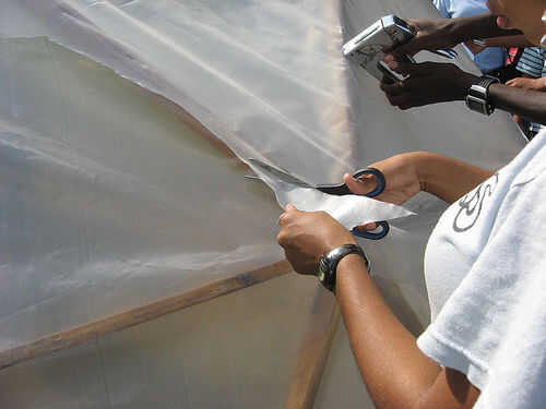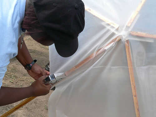Tire el plástico sección triangular sobre una apretada de la cúpula. La grapa lo suficiente como para sujetar el plástico a la madera en cada pata del triángulo. Luego volver y engrape el plástico a cada pierna del triángulo, cerca de dos pulgadas de distanciadas de grapado. Como haces esto, continuar suavizar el plástico para sacar las arrugas. Ayuda a doblar el plástico sobrante encima de sí mismo como grapas a la madera. Seguir cubriendo tantos triángulos como sea posible hasta que han utilizado hasta la lámina de plástico. Cuando la primera sección de plástico esté bien conectada, corte cualquier exceso que no cubre completamente una sección triangular de la bóveda.
