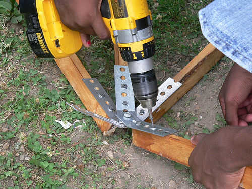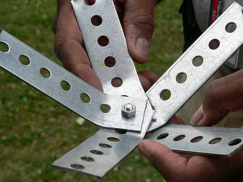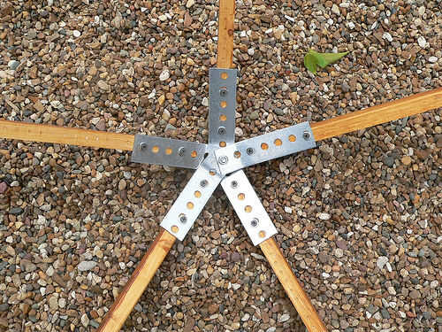 Usando el taladro con el accesorio de destornillador, fijar un brazo de un conector de 5 vías para una 42"(una) pieza de madera con dos tornillos (con la arandela alrededor de cada uno de los tornillos). Mira la imagen de abajo para la colocación de los tornillos. Una vez que la primera "A" pieza de madera adjunta, se repita este paso para los restantes cuatro brazos del conector de 5 vías. Repita para todos los cinco conectores de 5 vías.