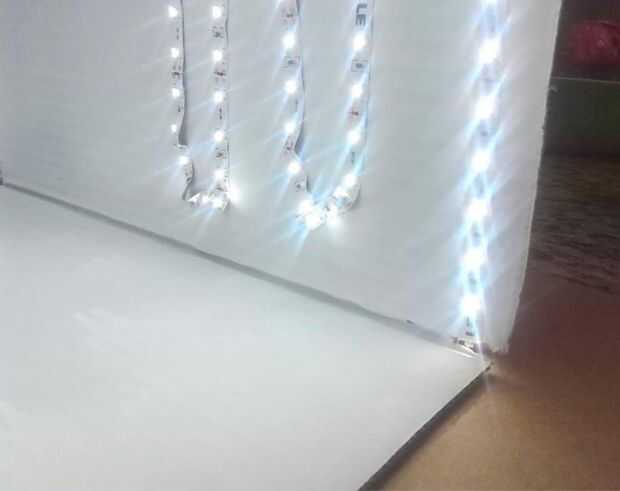 Después de que usted haya decidido sobre el telón de fondo apropiado, tendrá que comenzar con la construcción. Corte un pequeño agujero en una de las esquinas abiertas de la parte inferior de la caja. Esto es donde llevará el comienzo de la tira de LED en la caja y el cable de alimentación de la caja. Luego comenzar a desentrañar la iluminación de tira del LED y cinta adhesiva en el interior de la caja. La tira de la luz es bastante sencillo y fácil de adherirse a la mayoría de las superficies.