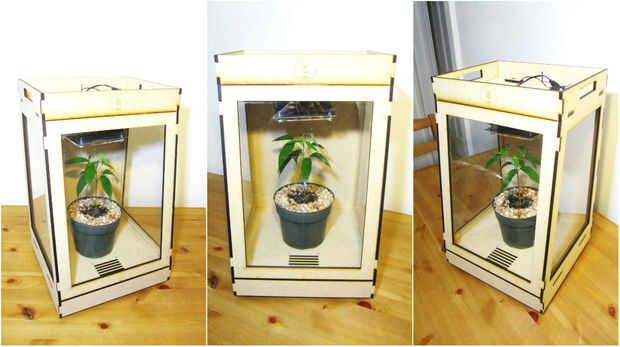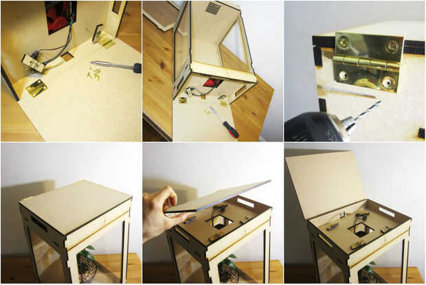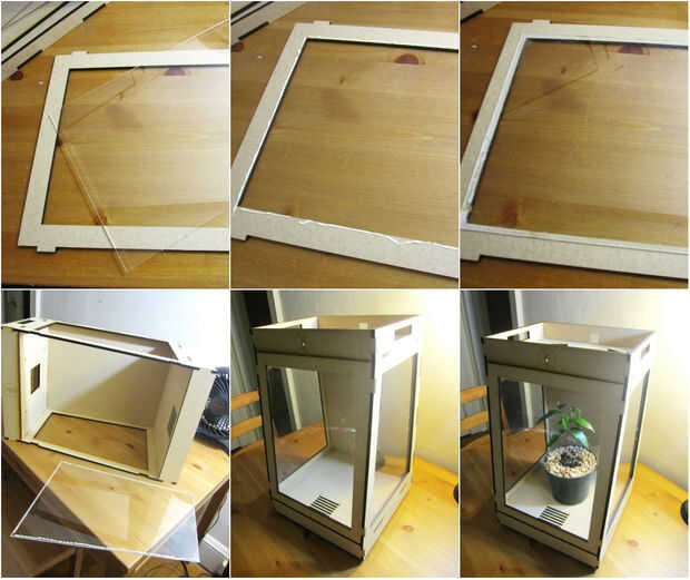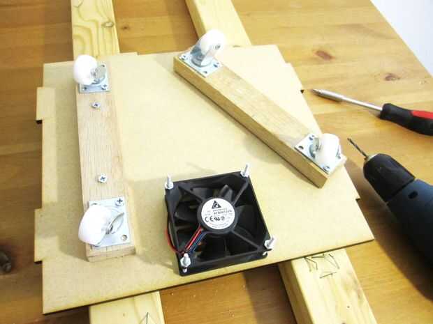 primero sujete las ruedas + ventilador en la parte inferior y luego pegar todo el acrílico cubre a los paneles laterales y frontales.