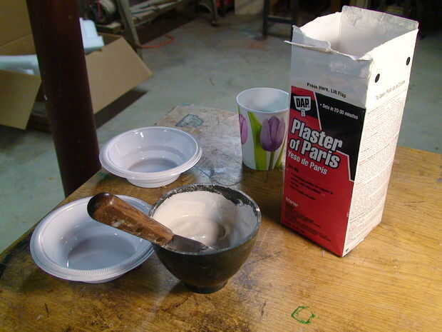 mezclar el yeso y poner en el Bol. necesita mucho de él y establece rápidamente!!!!!! luego aplasta la pera o cualquiera que sea comestible y en hasta la mitad.