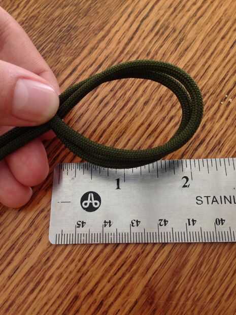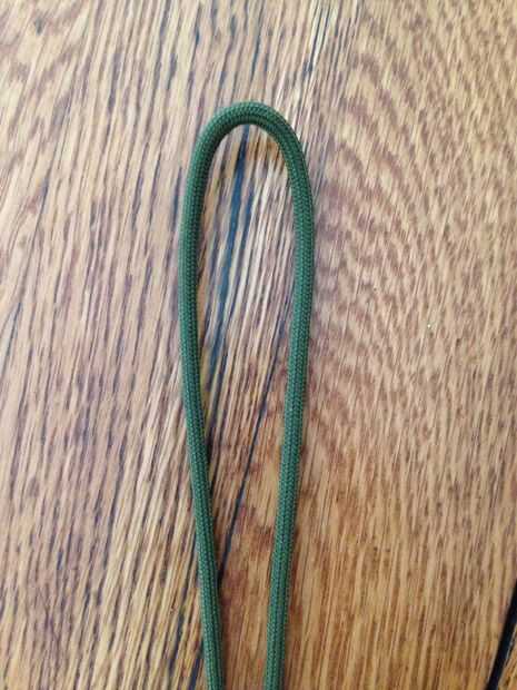 Doblar su hebra de paracord en la mitad para formar un bucle. Enrosque los extremos de trabajo en el lazo para hacer una banda de paracord; se trata de la base. Hice mía aproximadamente 2 pulgadas de largo, pero era un poco demasiado grande.