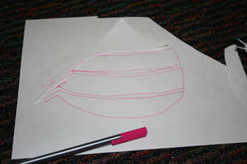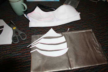 -Crear una plantilla de la taza del sujetador donde tienes 4 tiras en y 4 tiras de subir y bajar (sólo utilicé papel para mi plantilla). Estas piezas deben tener un espacio entre así que no corta el circuito. Sólo establecer su sujetador que se utiliza para este proyecto e intenta su mejor para hacer una plantilla que se adapta bien en la Copa.