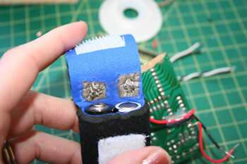 Asegurar la conexión a los cables con pegamento caliente. Luego coser un trozo de velcro en la solapa por lo que permanece firmemente cerrado. Asegúrese de que el hilo conductor toque firmemente las tapas de las pilas.