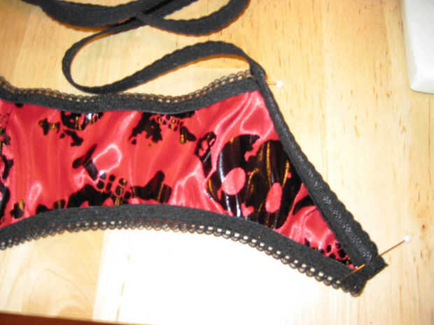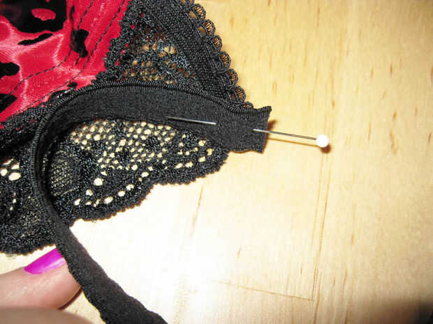 Coser la correa a la taza, derecho lados juntos, donde se marcó. Cortar el elástico, si no lo has hecho todavía, y plegar la correa así que puede coser el extremo cortado hacia abajo en un zigzag como en la última foto, para mantenerlo ordenado.