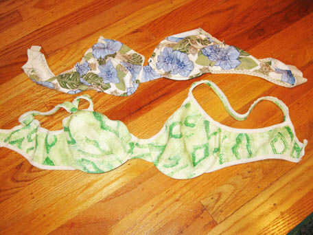 hice 1 bra parcial y 1 bra completa adicional mientras se trabaja el patrón. El verde en la imagen abajo es totalmente usable aunque el elástico es tan rizado parece realmente extraño trazado plano.
