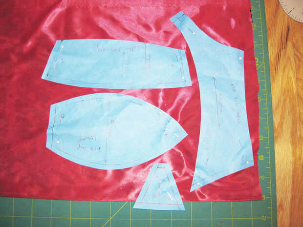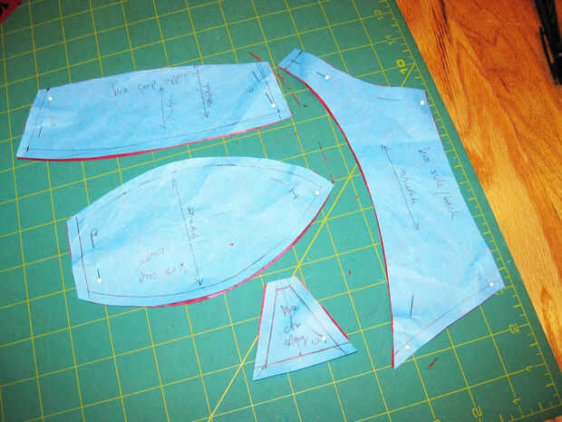 Cortar las piezas, 2 de cada uno. Recuerde colocar las líneas de estiramiento como marcaste la dirección stretchiest de tela. También corté la estancia de centro en un pliegue para eliminar una costura; el estiramiento en la estancia es arriba y abajo no de lado a lado. Si usted tiene un tejido muy elástico incluso puede interfaz la estancia o con otro tejido no elástico para estabilidad.