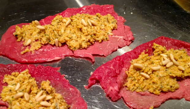 Tomar la miga de pan relleno y distribuir a lo largo de la longitud de la carne, comenzar a rodar en el extremo corto hasta han formado un rollo. Usar hilo de carnicero o puedes usar selecciones de diente, atar los extremos del rollo de carne para garantizar. Espolvorear la braciole con sal y pimienta.