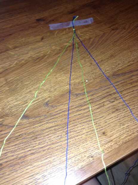 Haz 4 colores de cuerda (puede ser cualquier color). Con cinta adhesiva a una superficie plana y spred les fuera