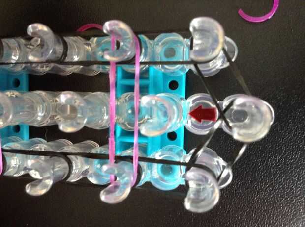 este es un diseño grande y fácil que parece una escalera! Va por supuesto que es el nombre del vamos a empezar!Fuentes:Telar del arco irisBandasGancho1 clip C/SPaso 1: Colocación de bandas Asegúrese de que la flecha es hacia fuera. Tomar una banda y