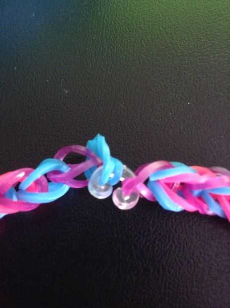 Así que ahora que han terminado su braclet vas a tomar tu braclet del telar. Ahora vas a sacar el elástico de color rosa. Consiga ahora te enganche y a través del elástico morado. Luego haz un clip C y ponerlo en la púrpura y el azul elástico. Ahora que terminaste el braclet! :)