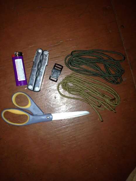 8 pies de paracord en color A. 8 pies de paracord en color B. Leatherman o pinzas Encendedor para derretir los extremos Lanzamiento lateral de hebilla Tijeras