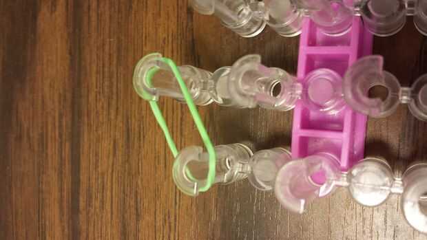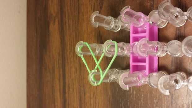 esto es un braclet muy fácil y divertido para hacer. Esperamos que disfrutes!Paso 1: materiales Se necesita: un telar, gancho, elásticos y un clip de C.Paso 2: Colocar los elásticos Primero escoger tres colores y a la clavija central. Sacó su color e
