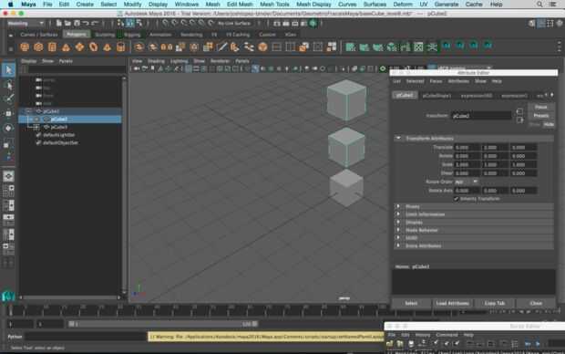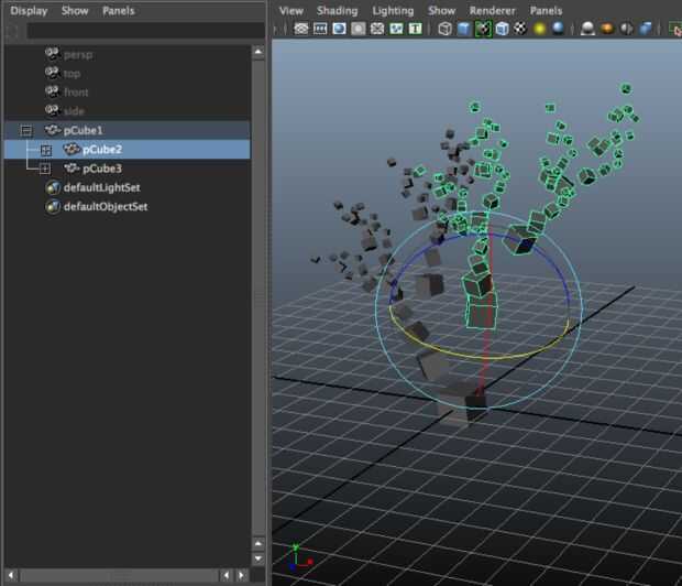 En el Outliner (Windows -> a Outliner) Seleccione pCube1 o pCube2, los dos hijos del nodo principal. Intente mover, escalarlos (0.5 es un factor de buena escala para empezar) y girarlos.