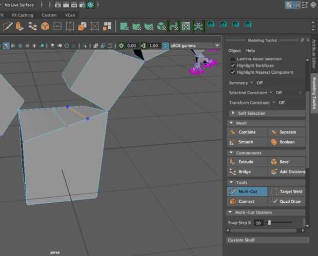 3. conectar las formas: hacer esto para todos los vértices. Para hacer más vértices disponibles para ajustar, utilice la herramienta multi-corte de las herramientas de modelado o buscar en el menú desplegable en la parte superior llamado herramientas de malla. Asegúrese de eliminar las caras que serían dentro de la forma.