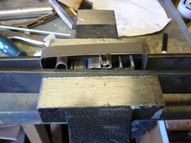 Cada cierto tiempo el hierro debe ser straigtened fuera poniendo entre las dos barras planas en la prensa (sin las barras, no puede enderezar hacia fuera bien y deja una textura en la plancha). Lo hice muchas veces para que cuando se hace al final, la plancha no deforme más allá del reconocimiento. Es importante hacer esto al final para que pondrá en contacto con todos los de la carne.