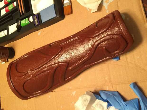 Pintar un acrílico marrón (Umber quemado en mi caso) sobre el bracer todo. Te recomiendo la cinta de los anillos, así que no tienes que quitar pintura del metal más tarde.