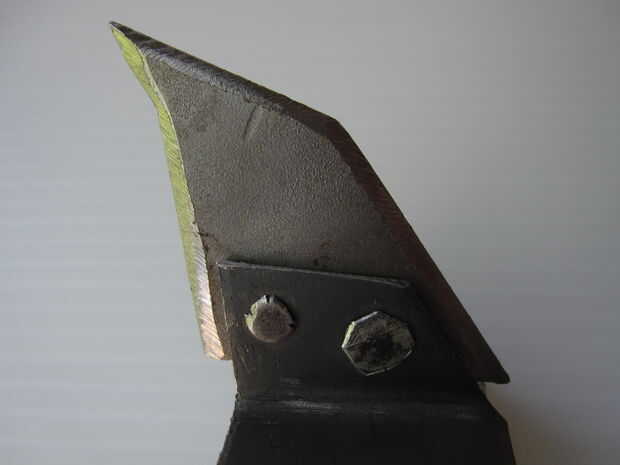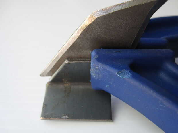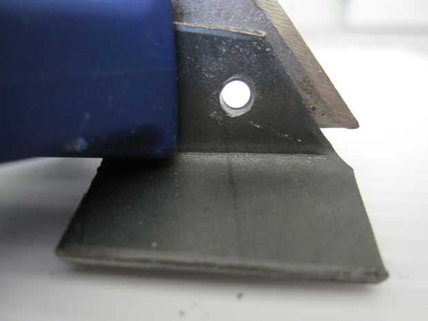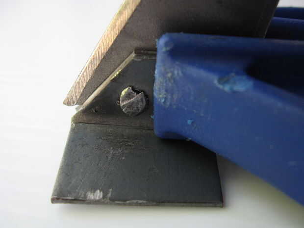 Una vez que se perfora el agujero, toma un clavo de techar y cortarla para que sea lo suficientemente larga para meter 1/8 de pulgada más allá del soporte pasado. Usando el martillo de bola, golpear el extremo de la uña hasta que firmemente han remachado el clavo mediante el soporte de la cuchilla y el otro soporte.