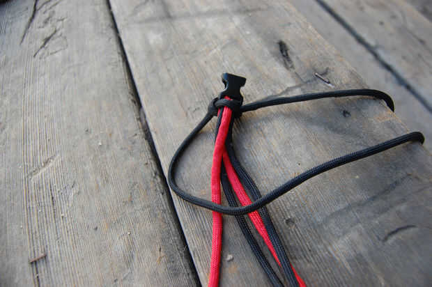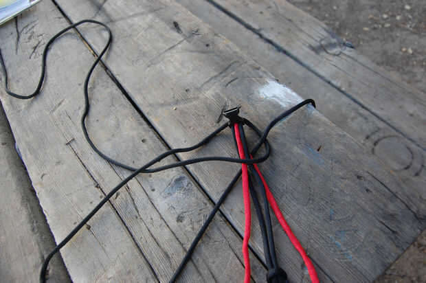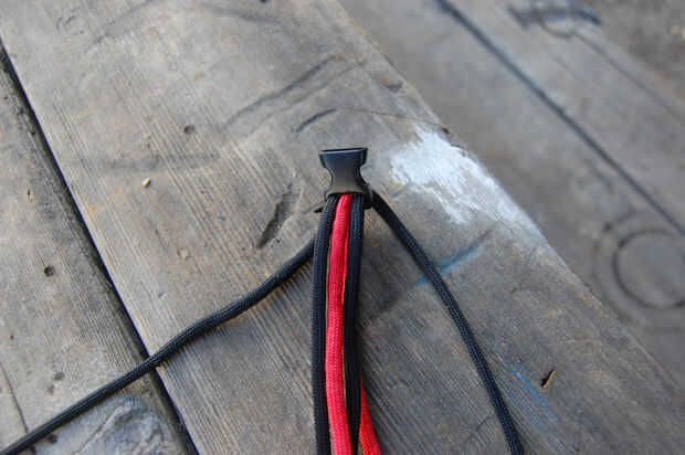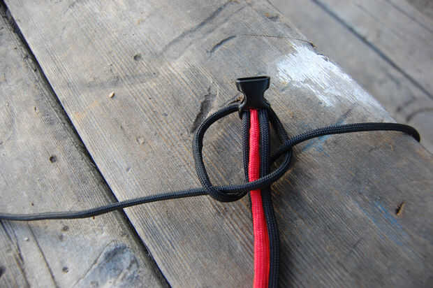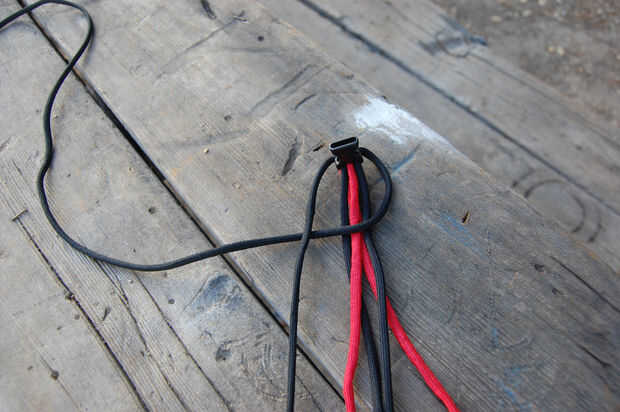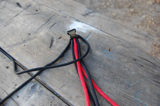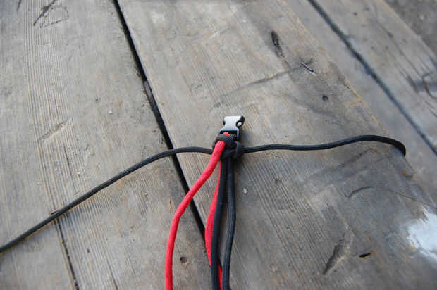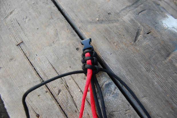 Elige uno de los dos cables largos para comenzar con. Coloque el cable en el cuerpo principal de la pulsera. Lugar la perpendicular cable y sobre el primero. Cuerda el segundo bajo el cuerpo principal y el espacio creado por la primera cuerda.
